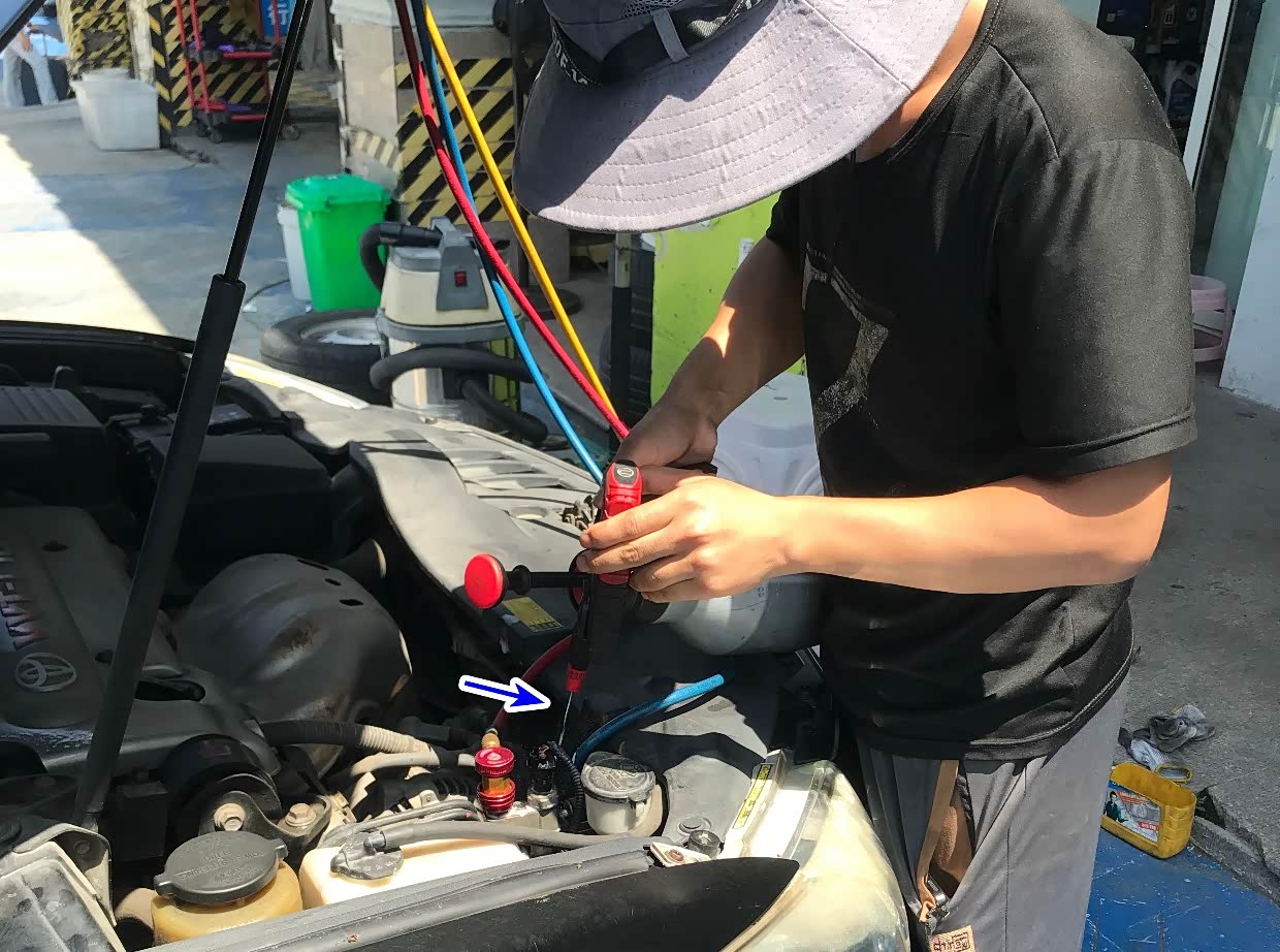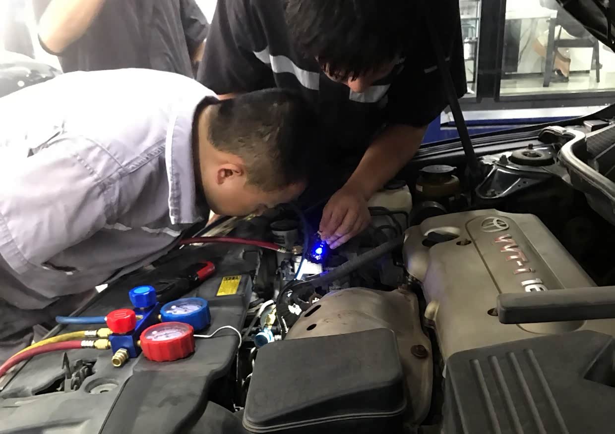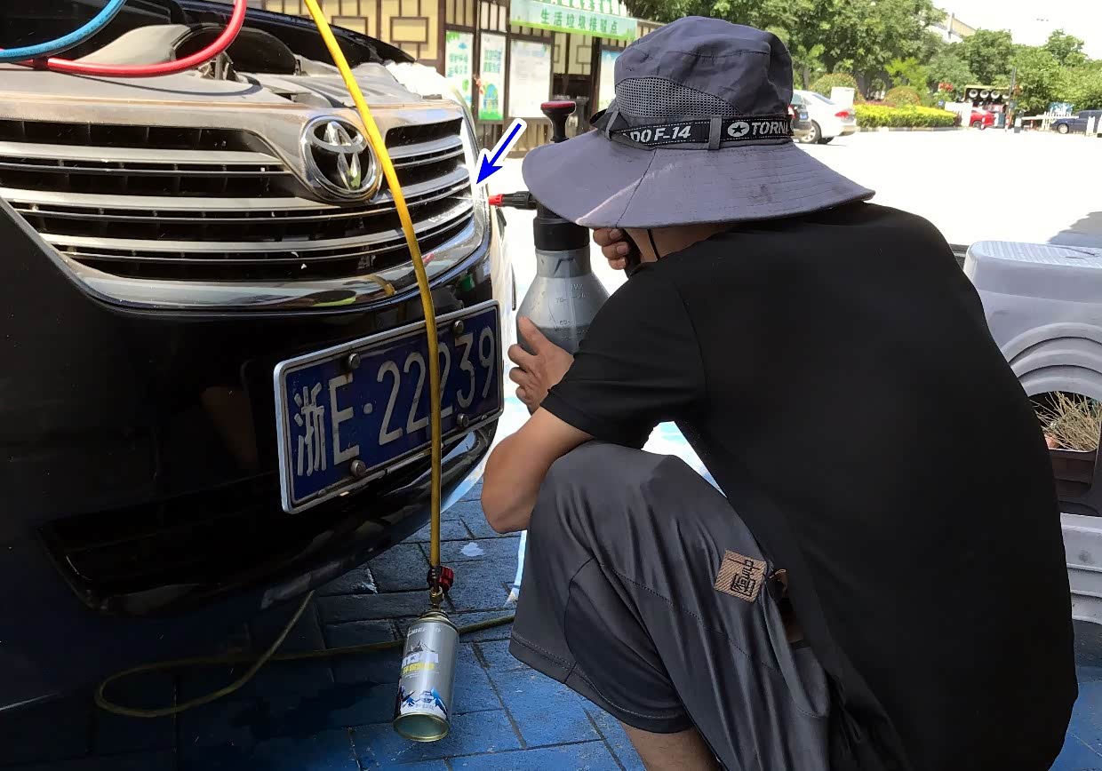 这次换了一家店检查,8月正是最热的时候,在户外查找空调系统渗漏点,师傅相当敬业。