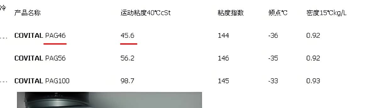 PAG数字越小粘度越低,46表示40度时的运动粘度为46 cSt左右,粘度指数144。