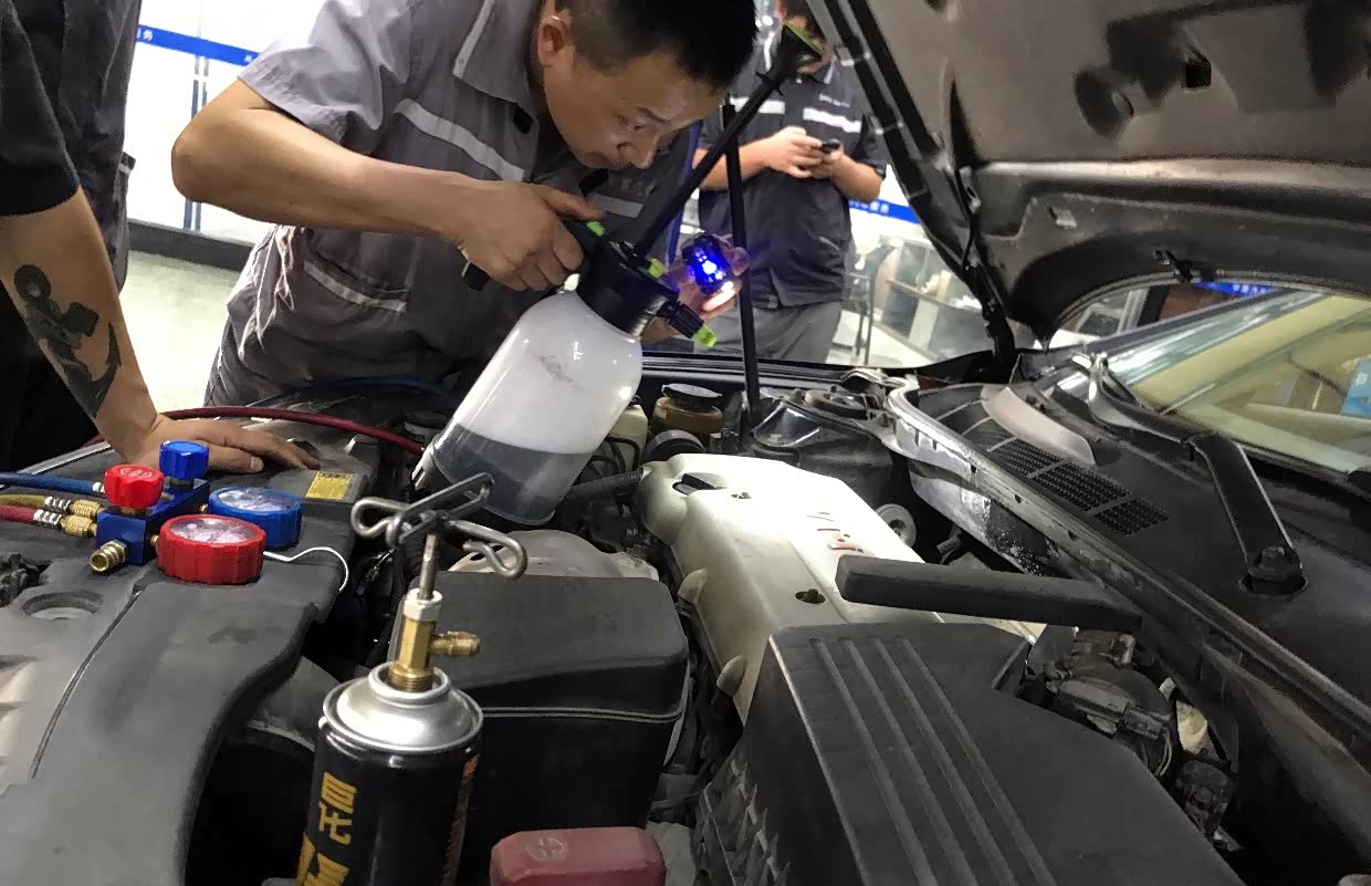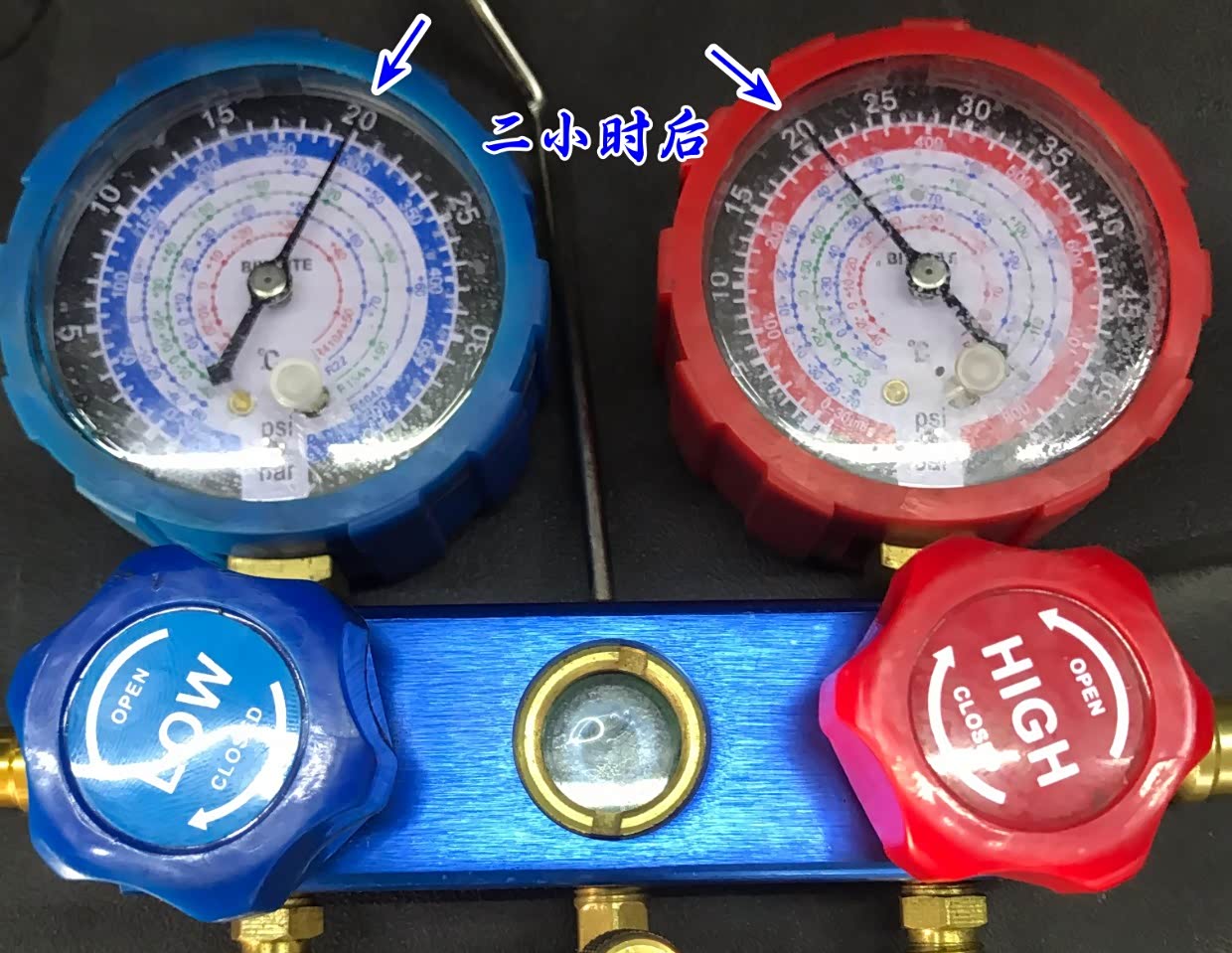 酷热下找了近一小时,可是没有找出渗漏冷媒的地方。