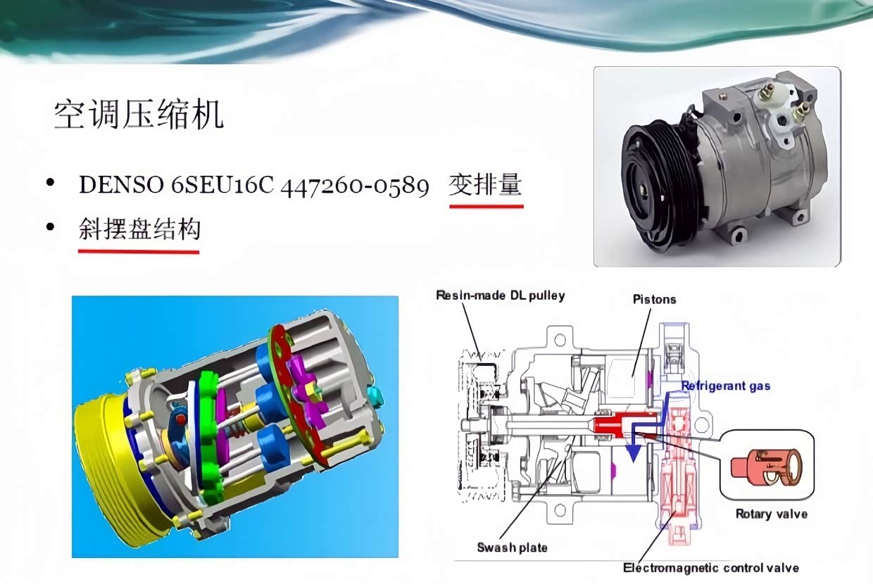 从压缩机的结构和排量来看,达因压缩机和电装压缩机都是6个气缸,排量160cc,排量可变范围4.7 - 160cc。在实际使用过程中,不管是达因还是电装,制冷效果都不错。