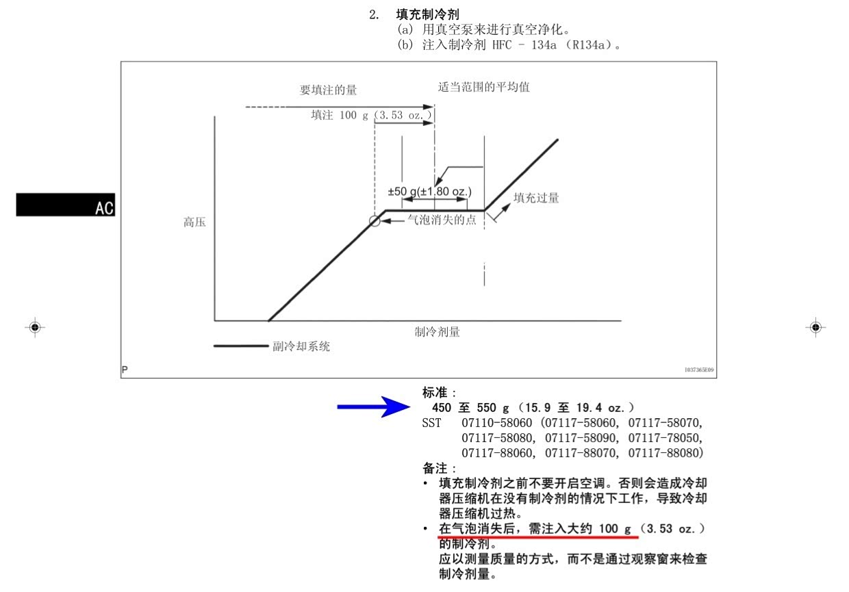 凯美瑞的维修手册上要求,冷媒添加量450 - 550克之间。