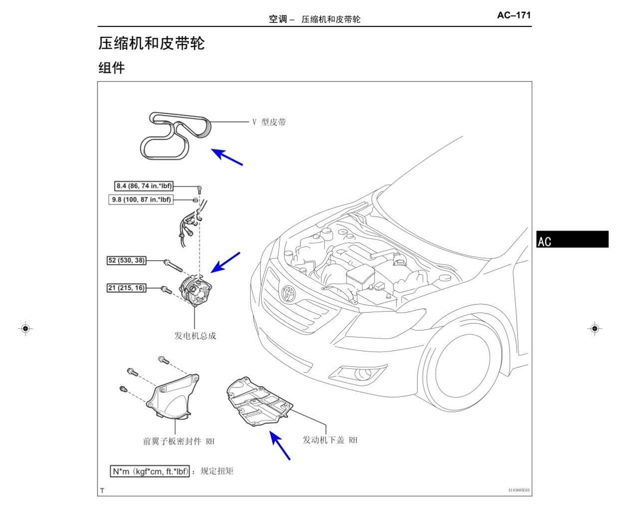 更换空调压缩机需要先松掉皮带,拆除发电机,拆除一小块下护板。