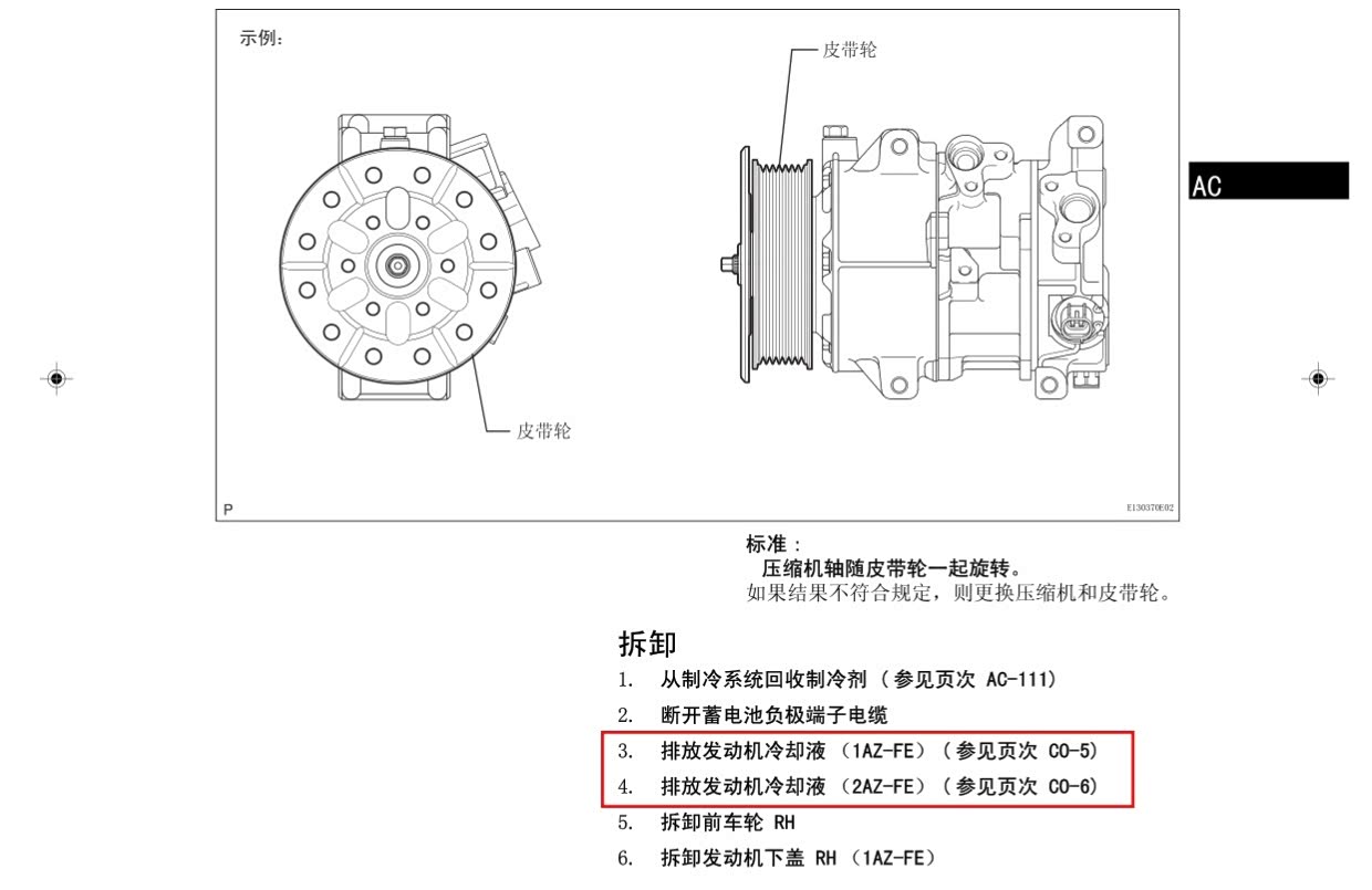 凯美瑞的维修手册上介绍,更换压缩机需要放掉冷却液后拆水管。