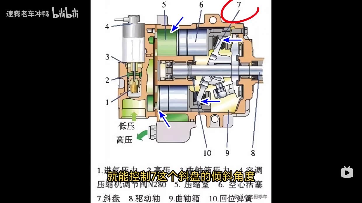 斜盘靠后时,活塞行程长,排量变大,做功强,功耗高。