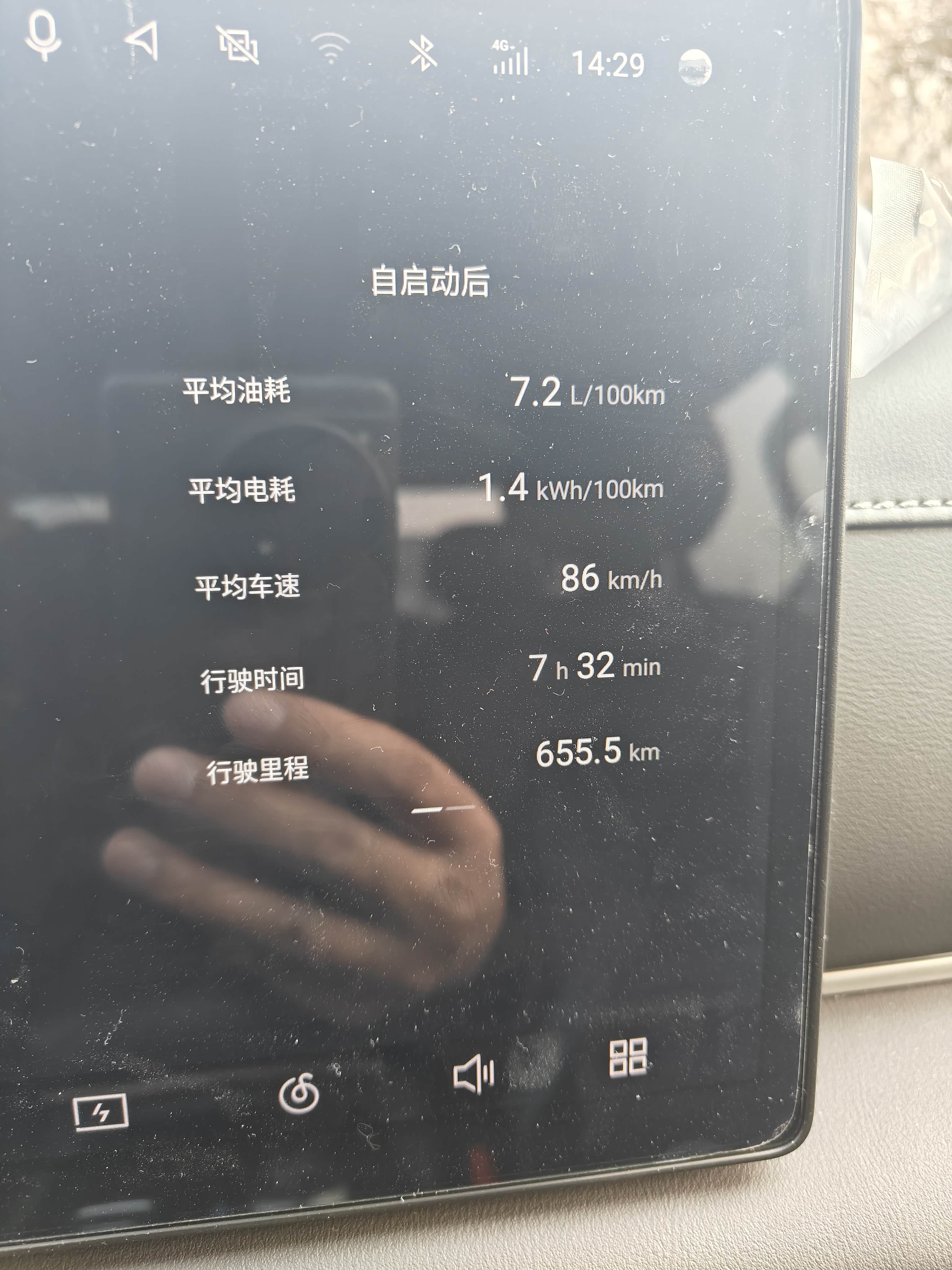 照片中从满油满电出发的,全程定速巡航100公里/小时,中午吃饭的时候充电半小时,充了15°电,行驶到655公里的时候服务区停车休息时熄火了,导致计算提前结束,大家可以参考下已经行驶的里程、平均油耗、平均速度,剩余里程。