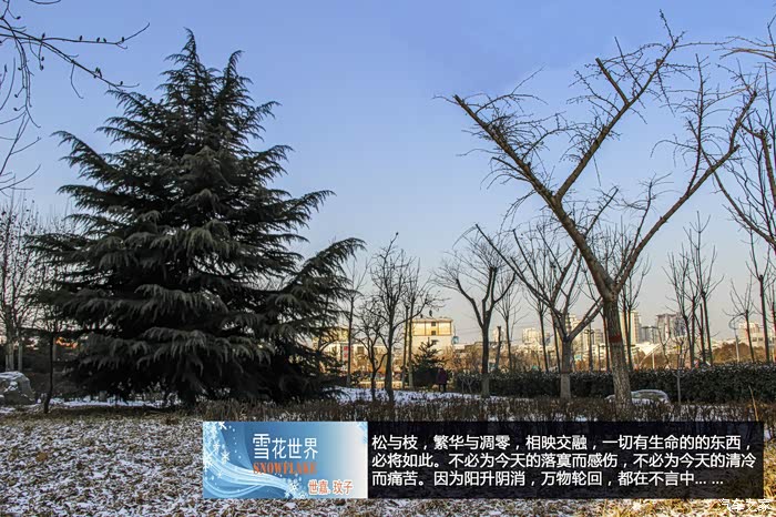 忽然一天夜里,天降雪。貌似今年没拍过雪景。于是大清早起来,胡乱喝了一口稀粥,拎起相机,对老公说了句:我要拍雪景去了!!然老公一句话,让我差点儿噎死——“连地上霜都不算,还拍雪景啊?!"
