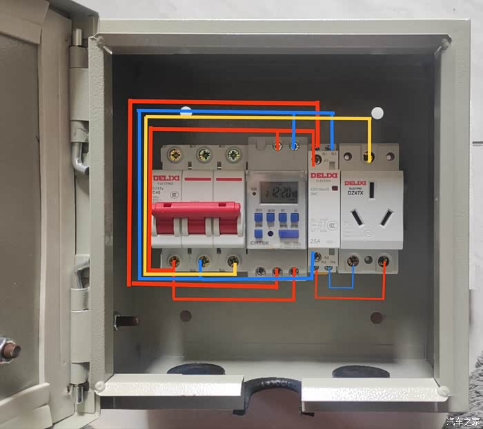②断路器+正泰nbl25A时控开关+德力西继电器25a+德力西轨道16a插座(这是常见牌子,不能算广告吧