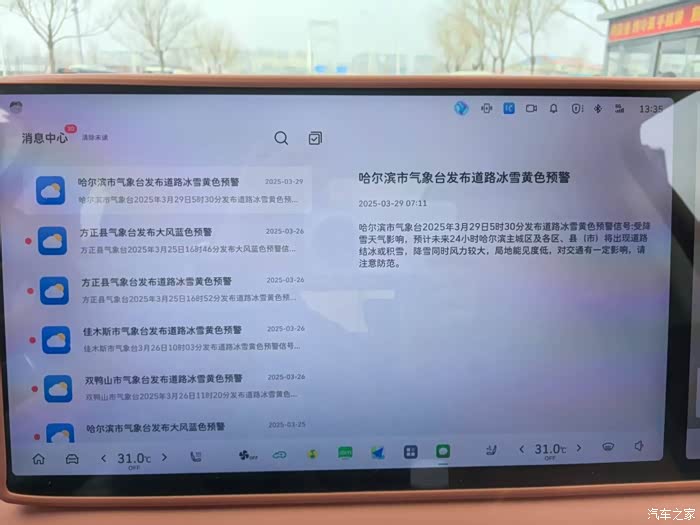 我用蓝山之后,其实有一个非常贴合我习惯的地方,让我感觉十分便捷,就是蓝山自带的这个天气预报,我每次出门前都喜欢看天气预报,东北这边也会遇到极端天气,最可怕的就是道路结冰,所以以前的时候,都会先拿手机查一查,现在不用了,车就能自动提醒了!