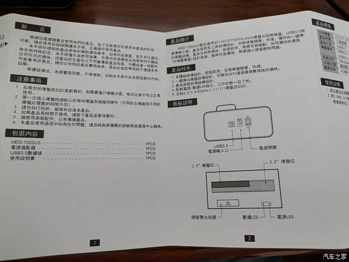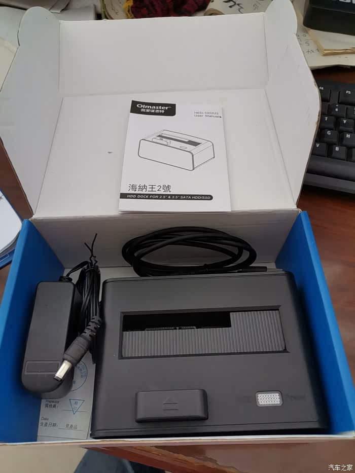打开纸盒子里面就是一个硬盘盒子,配套简单,一个220V电源线和一条数据线。2.5寸和3.5寸的硬盘都可以使用,只要数据接口一样就可以。