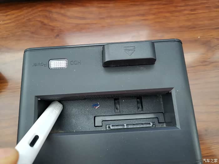 这个凹槽就是插硬盘下去的,硬盘的接口对准凹槽右下角的接口就可以,用点力气按下去就行,左上角是电源指示灯,右上角的是取硬盘的按钮,用力按下按钮,硬盘就会自动的弹起来。