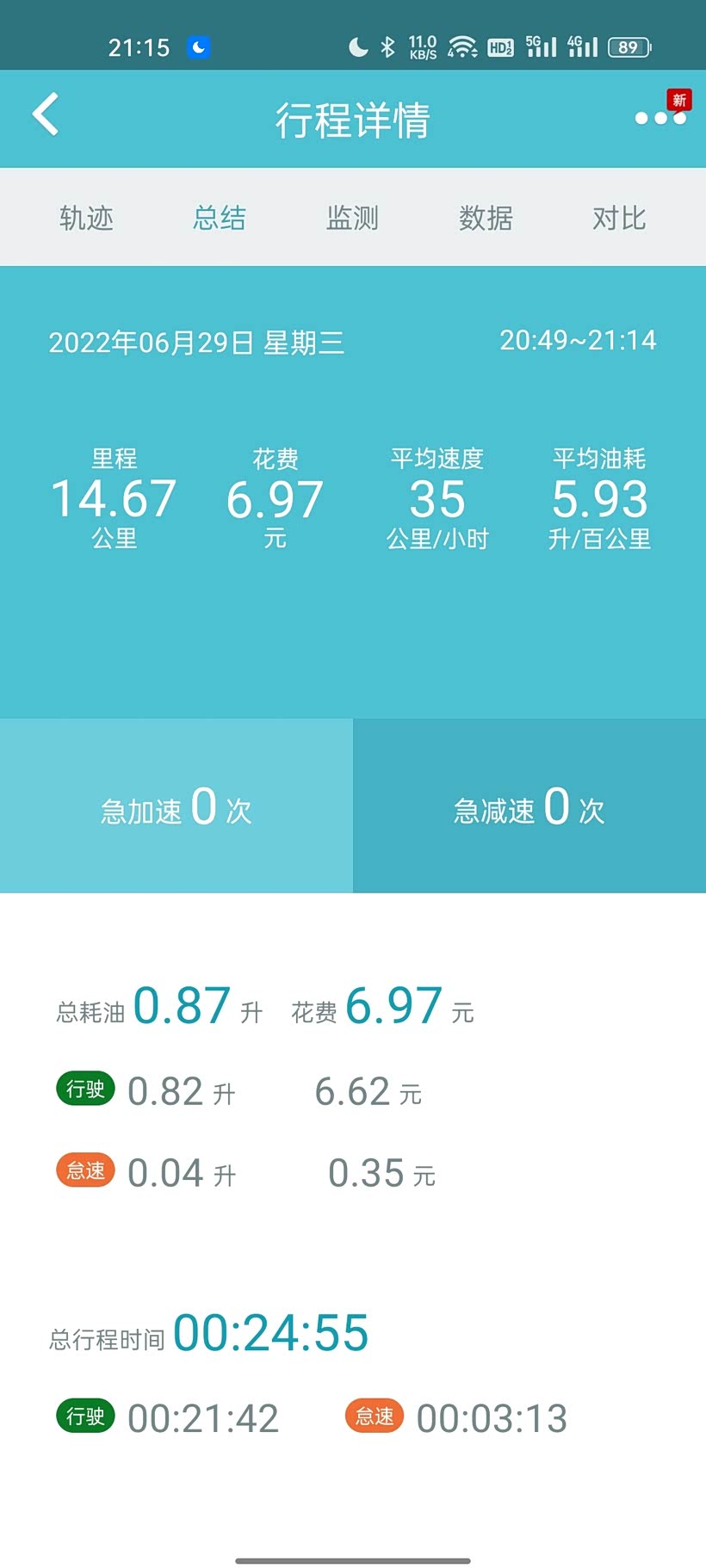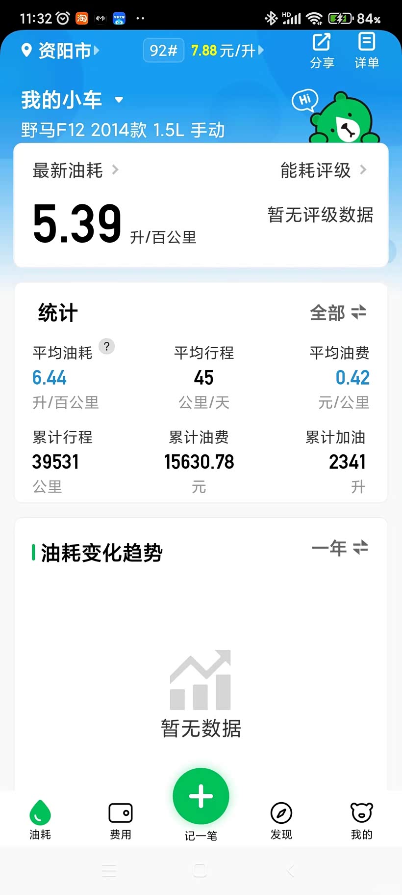 这个算是真是油耗了,每次加油都输入里程和加油的量,用的小熊油耗软件,比较省油的车子了