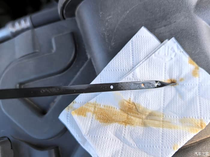 停车一二十分钟后,抽出黄色的机油尺,用干净的抹布或者不掉碎屑的纸巾擦干净,将机油尺插回发动机,等待一二十秒再抽出来,看机油尺末端的机油浸入痕迹。从照片中可以看到机油液位位于高限和低限(两个空)之间,好的很。