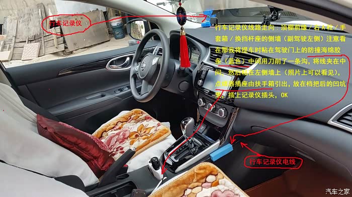 后视镜型的行车记录仪的走线,没有破坏原车电路,利用点烟器引电接出的,见下图:
