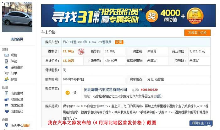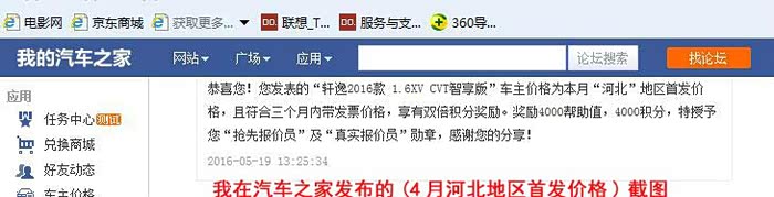 “恭喜您!您发表的“轩逸2016款 1.6XV CVT智享版”车主价格为本月“河北”地区首发价格,且符合三个月内带发票价格,享有双倍积分奖励。奖励4000帮助值,4000积分,特授予您“抢先报价员”及“真实报价员”勋章,感谢您的分享!”