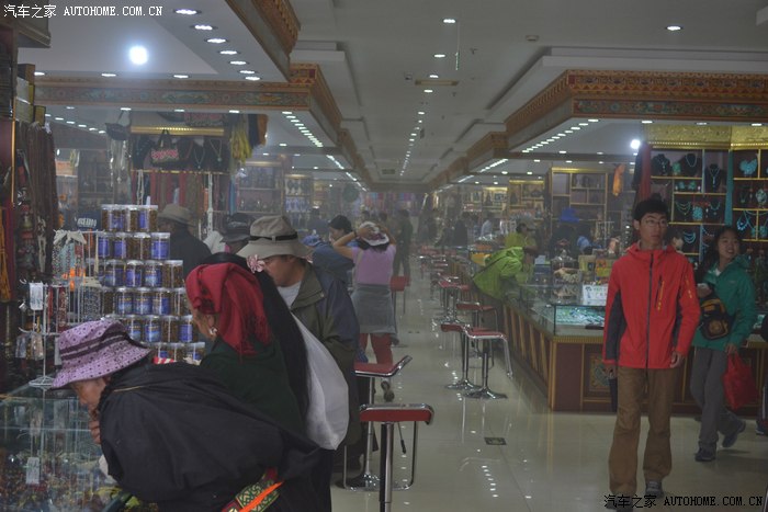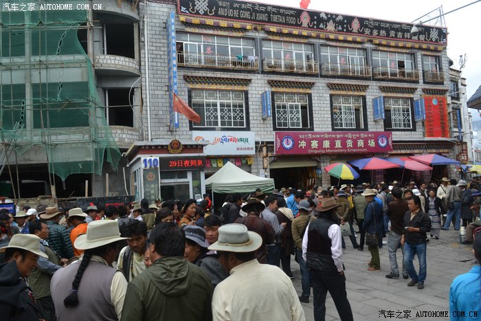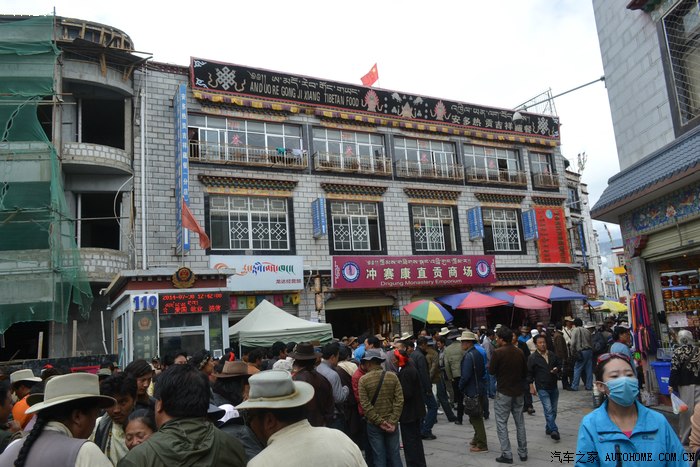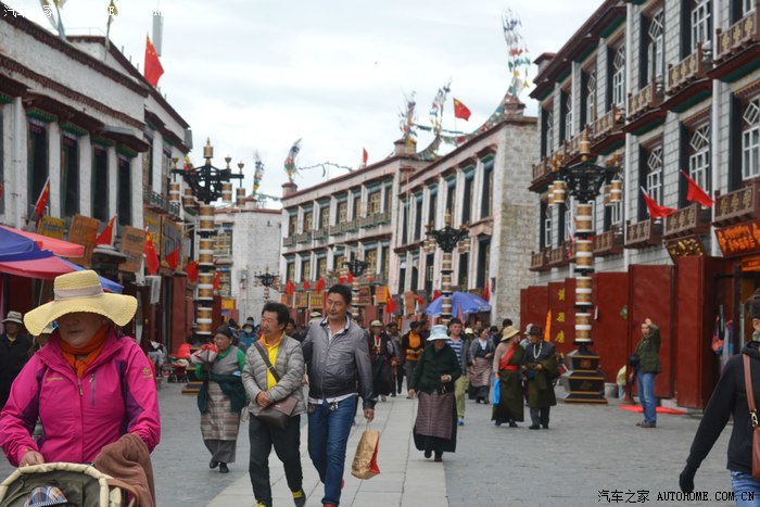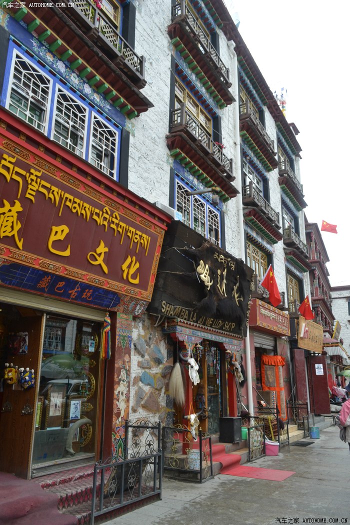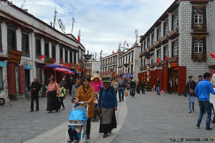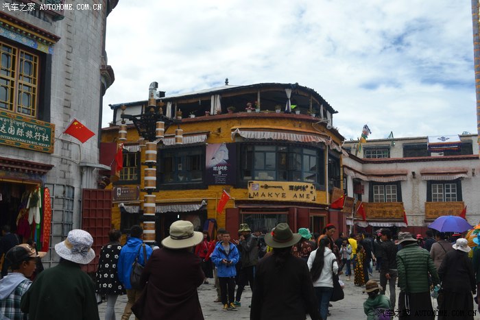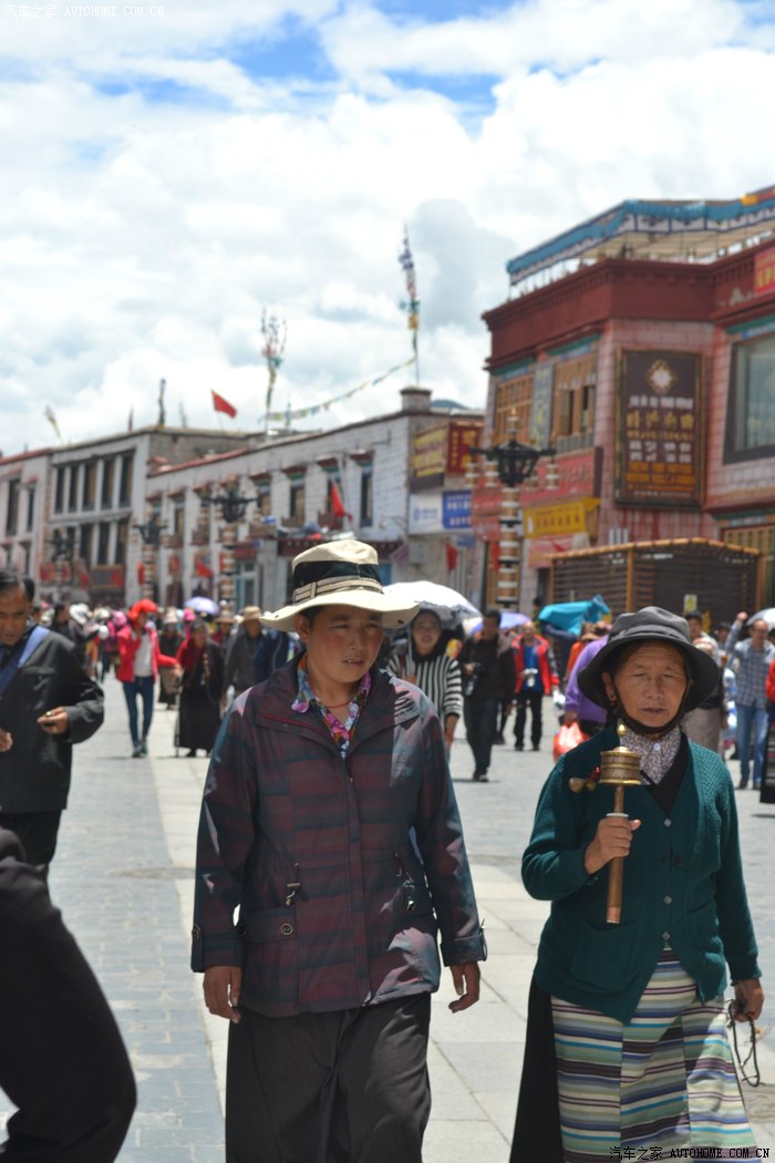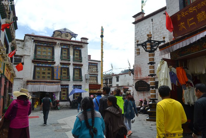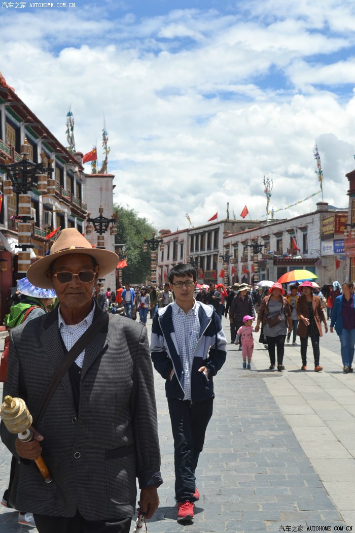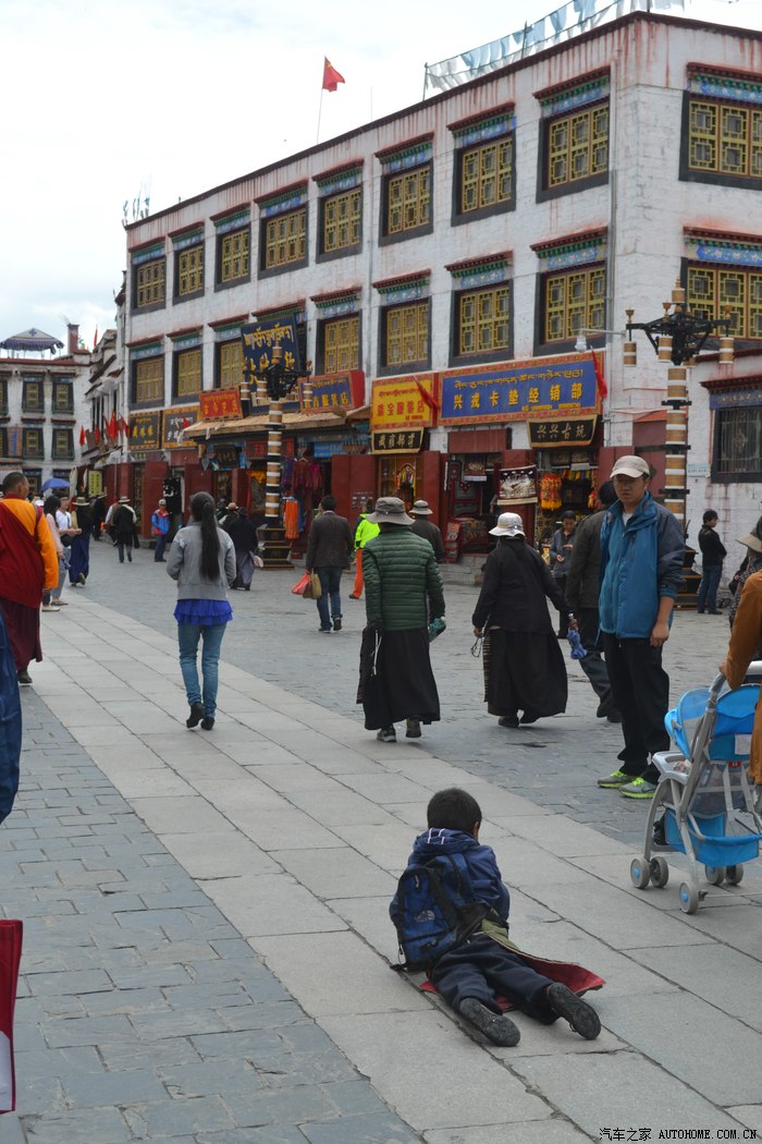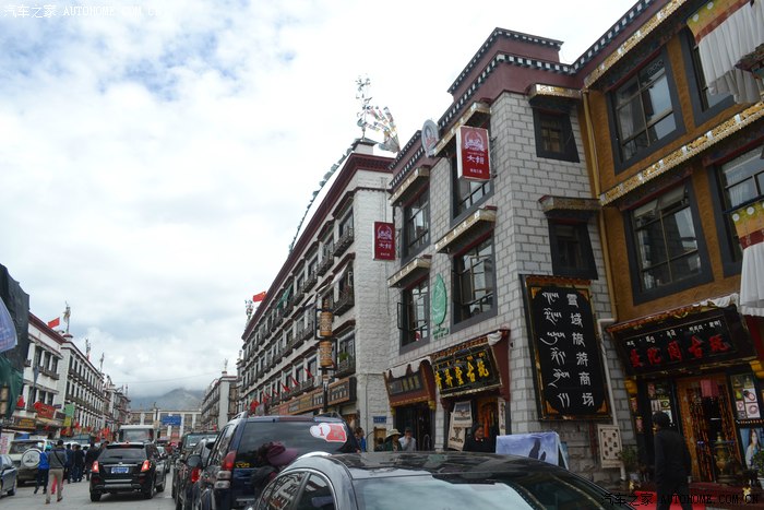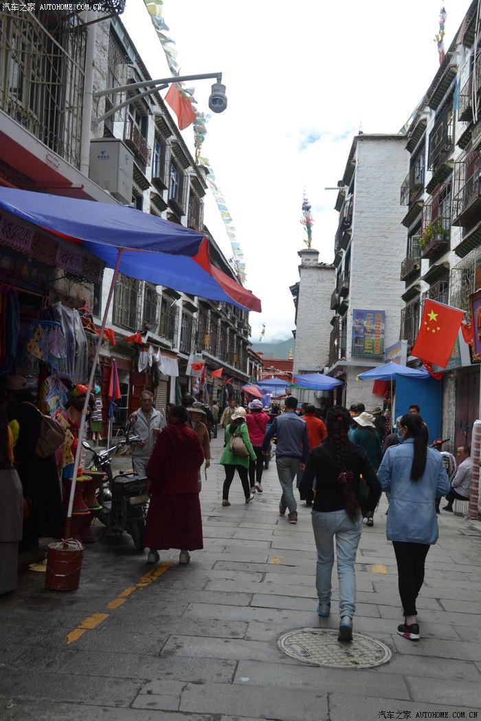 这一路上,我专门找了家西藏特色甜茶馆,里面人声鼎沸,每个人都守着一杯茶和别人聊的火热,老板娘招呼我先去拿杯子找位置坐下,有人会给你倒茶,随后给钱就是了。甜茶的味道和我喝的奶茶差不多,关键是听不懂人家说啥,呆了一会儿只好灰溜溜的逃掉。拉萨的街道非常干净整洁,完全没有内地城市垃圾遍地的样子,街道两边的楼房都是整齐划一的3-4层楼,统一的藏式风格,古朴敦实,楼下门面房是各种商店和饭店,人多的用摩肩接踵一点不夸张。我不知怎么走着走着,走进一大群藏族人聚集的地方,每个人都说着我听不懂的话,手握着手在衣服里打着暗语,一打听才知道这是自由市场,人家那是在做生意谈价钱。