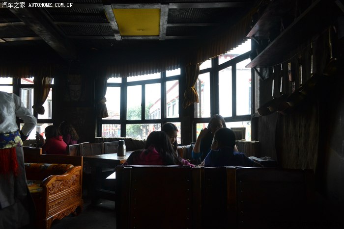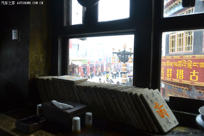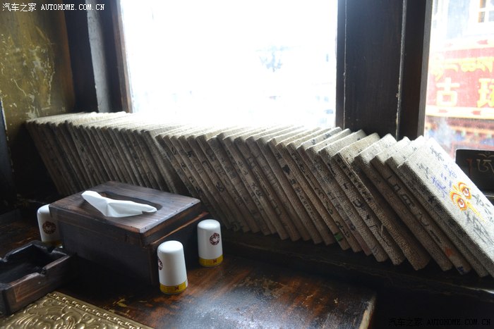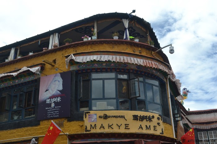 就这么漫无目的在八廓街流浪,在突然闻到重重的松油熏香味时,猛一抬头便看到了这座被文艺青年们热捧传说中的-玛吉阿米,餐厅的来历已经被各种爱情诗歌和文艺小品渲染的路人皆知,作为文艺和二笔合体青年的我,自然不能免俗,必须进去感受一下。玛吉阿米没有想象中那么大,一楼是厨房和仓库二楼是餐厅,三楼是个露台,沿着狭窄油腻的黑楼梯上到二楼餐馆的正厅,位置不多,我和三个不熟悉的游客拼桌坐在一起,刚吃过饭只好要了份藏茶和薯条。我对面的哥们要了份咖喱鸡饭,边吃边聊,这哥们也是神仙级别的人物,骑着一125摩托从昆明走滇藏来到拉萨,我们就这么有一搭没一搭的说笑着一路见闻。餐厅的生意异常火爆,要想像传说中那样拿杯茶静静地坐在这里等待情人或是思考人生,难度极大。坐在窗口的位置,可以看到八廓街上来来往往的人群,记得去年在青海,老爸看着满山的牛羊说“你知道怎么分别草原上的牛羊和狗么??你看,这低头吃东西的都是牛羊,抬头看东西的都是狗。”老爸威武!!区分这朝圣者和游客们也可以以此类推,朝圣者目光深邃脚步坚定只向着自己信仰的方向,游客们甭管哪个民族都是乐乐呵呵东张西望,也只有坐在这里淡定的看着,才会发现两种不同目的的人混杂在一起,组成的这支奇异的转圈队伍。餐馆窗边放了很多羊皮草本,封面标注着不同的省份,里面写着各式各样的留言和感悟,我翻出陕西那本,在最后一页上留下自己的足印-小驴到此一游,嘻嘻。