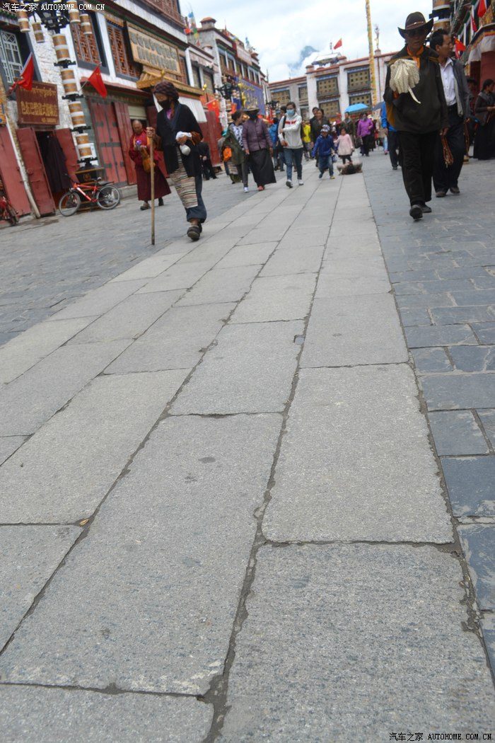 走出饭店,右手边就可以看到大昭寺广场。跟随人流安检后进入广场,自然而然的顺时针围绕着大昭寺转起圈来。转,在西藏是人们表达信仰的一种方式,可以转山转湖转寺转塔,既然来了,那就入乡随俗的转一转吧。我们转动的这一圈街道就是八廓街,在街道中央有一条五块光亮石板铺成的道路,那些一步一拜转寺的人都会在这条石板路上叩首跪拜,更多的人则是嘴里念念有词,眼神纯净脚步稳健的走着自己信仰的大路。