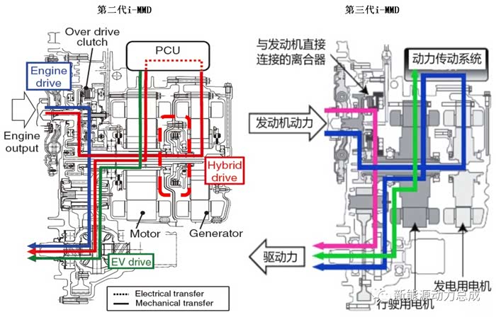 2019年随着本田第十代雅阁上市后使用第三代iMMD国产变速箱,本田的iMMD智能多模驱动系统由高效发动机、集成双电机的E-CVT、功率控制单元PCU以及高放电倍率的锂电池组成。CVT是无级变速的意思通过钢带模拟挡位,E-CVT与CVT完全不同,简单理解电子无级变速通过电机变速模拟挡位。重点说说第三代iMMD变速箱与二代区别,变速箱系统架构相较于前几代没有太大变化。下图是第二代与第三代iMMD系统的剖面图,我们可以看出第二代iMMD包含两个离合器:一个连接发动机?车轮的湿式离合器,供发动机高速直驱使用;一个发动机与发电机连接的常闭离合器(下图红色方框)。与第二代相比,第三代主要区别是取消了发动机与发电机之间的常闭离合器改为干式单片离合器。