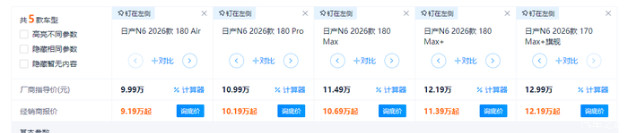 东风日产N6的设计,不仅仅是看着好看那么简单。它可是斩获CMF设计奖、FDA设计金奖、MUSE设计铂金奖三大国际奖项的车型。来头可不小。东风日产N6,作为天演架构下首款插混轿车。同时也被称作是【插混版N7】的中型车,全系涵盖了5款车型,9.99万到12.99万售价区间。价格可以说直接下探到了A0级车的区间,降维打击了。
