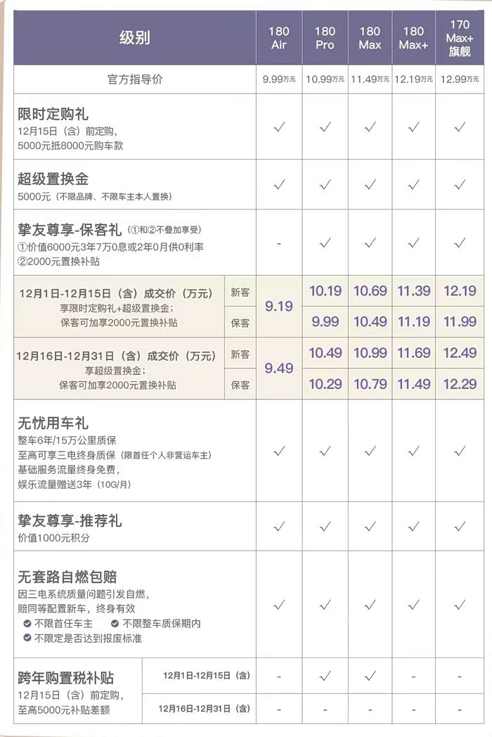 东风日产N6还有6年15万公里的质保,三电终身质保,基础流量免费,3年娱乐流量赠送。此外,只要是自燃,厂家直接更换新车,这一点也反映出厂家对自己产品的自信。另外还有一些限时的优惠政策,大家可以了解一下。毕竟今年买车还能省不少钱呢,购置税一栏最起码就是1万多块钱。
