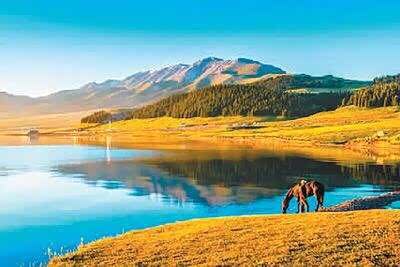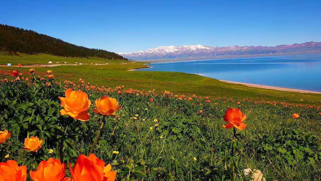 赛里木湖 湖边绿草如茵,百花绽放,牛羊在悠闲地吃草散步