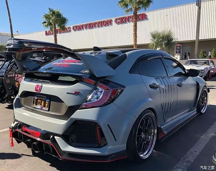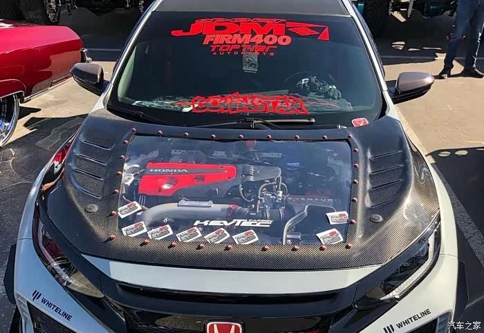 除此之外,下面这台灰色竞技姿态的FK8 Type-R在搭配着SSR Professor SP5轮毂后,除了车身有着许许多多碳纤维饰件,其中最大的亮点就是透明的碳纤维引擎盖了。在太阳下,看着大面积的碳纤维与***着红头引擎供人们欣赏,只能说简直不要太帅!