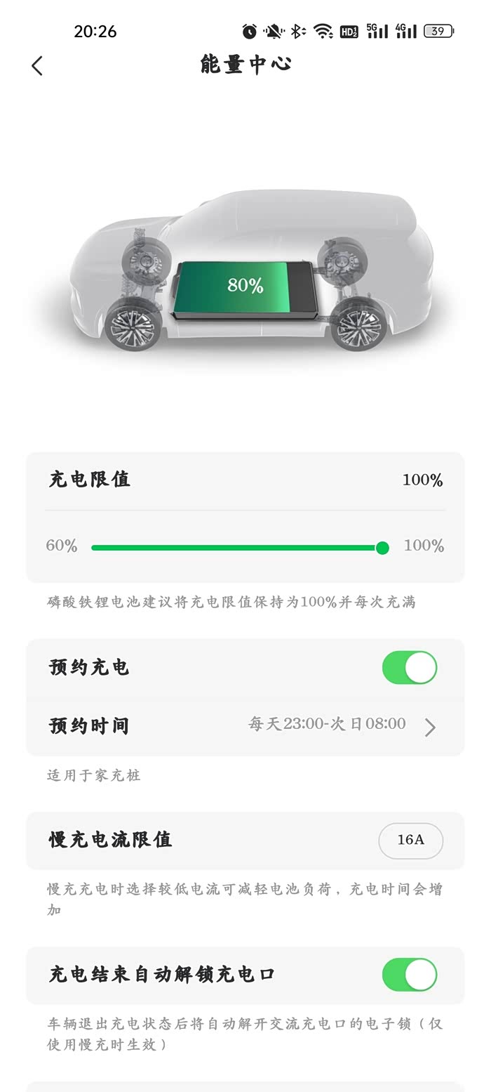 其次是慢充,后来家里车位装了启源的家充桩,充电桩功率7.5KW,充电电流也可选择,有32A,16A,8A等不同规格,电流越低,充电速度越慢,当然对电池的负荷也就越小。我一般选择16A电流,预约晚上11点开始充电,20%开始充的话,一般7小时左右就可以充好了。家充桩的优点就是可以预约充电,晚上半夜充,可以享受谷电,进一步降低用车成本。