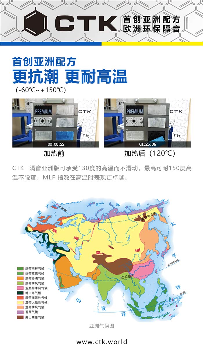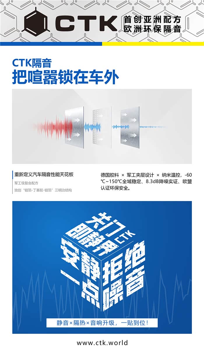 隔音材料的选择,会直接影响到隔音效果,此次升级使用的欧洲环保隔音CTK,专门针对针对亚洲市场而开发出了一系列汽车隔音专用产品;它的全系产品均通过了欧洲环保安全认证,真正做到了零甲醛。不仅如此,CTK在极端环境下的表现也很卓越,其可以承受130℃的高温而不滑动,150℃高温不脱落,可以轻松应对亚洲多变的气候环境。