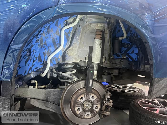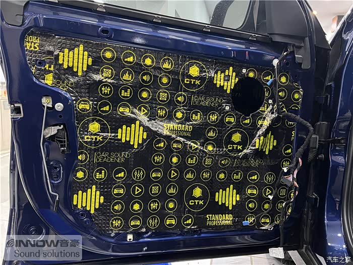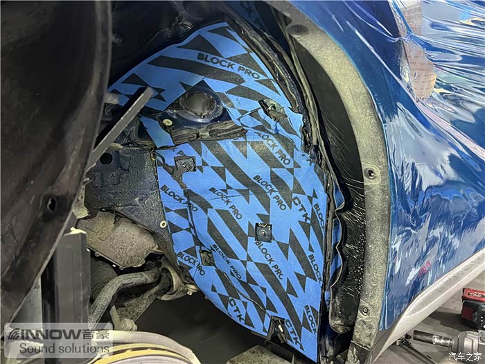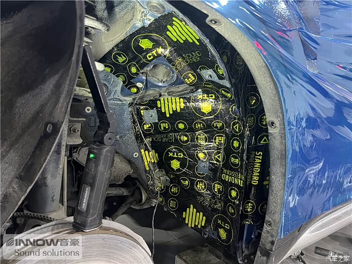 经过道路测试,技师发现原车的噪声主要分为两种,第一种是风噪;第二种是路噪和胎噪,因此技师使用欧洲环保隔音CTK,对汽车的前门板和四轮翼子板,做了针对性的隔音处理。