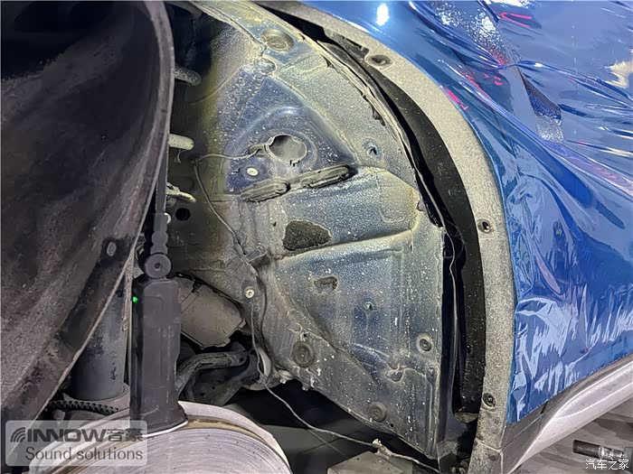 轮胎与地面摩擦难免会产生路噪和胎噪,此类噪声主要通过四轮翼子板传入到车厢内部。技师先使用欧标止震板对四轮翼子板做止振处理,减少钣金振动的产生;再使用弹力棉对该部位做吸音处理;最后使用低频王隔音棉做隔音处理,这就切断了路噪和胎噪的传入路径,将此类噪声阻挡在了车厢之外。