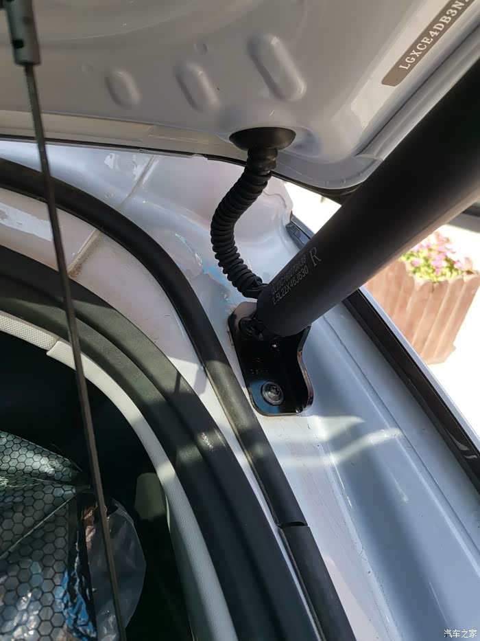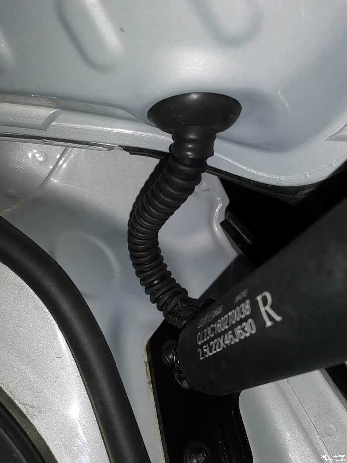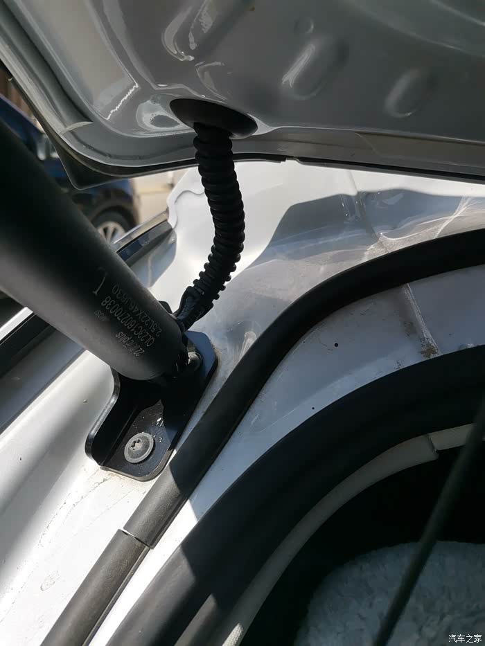 接下来就是装电动杆了,原车的液压杆的头子上卡扣用一字螺丝刀撬起来就能拿下来,上面的支座不用拆,下面的支座装新的,装电动撑杆的时候下面那头先装好,装上面这头的时候把后备箱门用力的往上推一下,这样可以把撑杆装进去了,另外一边同样操作!
