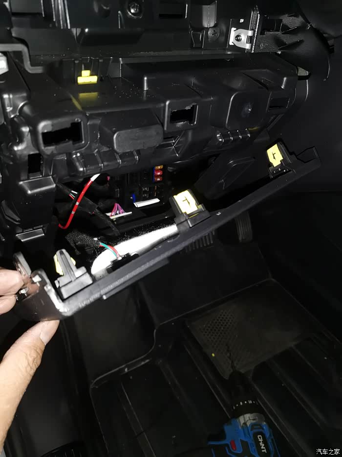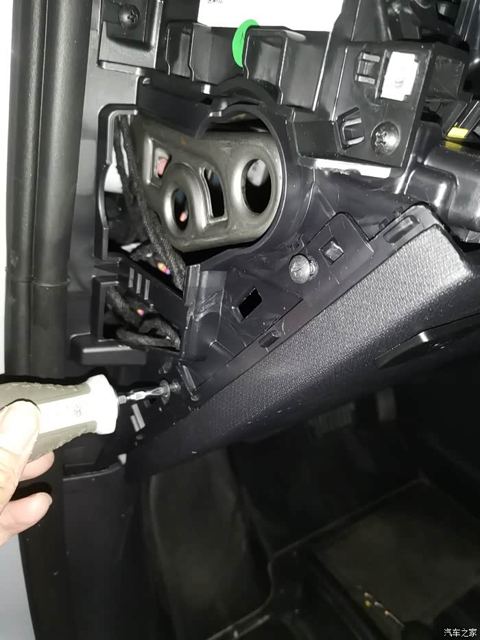 我在这个位置装了前按键,塑料板可以用大的剪刀开孔,后门按键空也可以用剪刀开孔,有开孔器更好(15毫米的开孔器应该够大了)