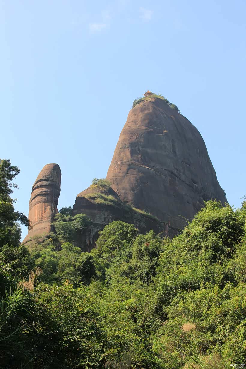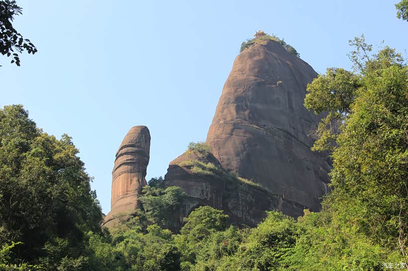 丹霞山上建有亭子,游人可沿栈道攀登至山顶。可惜我们实在没有力气爬上去,只能望着那亭子徒然感叹了。