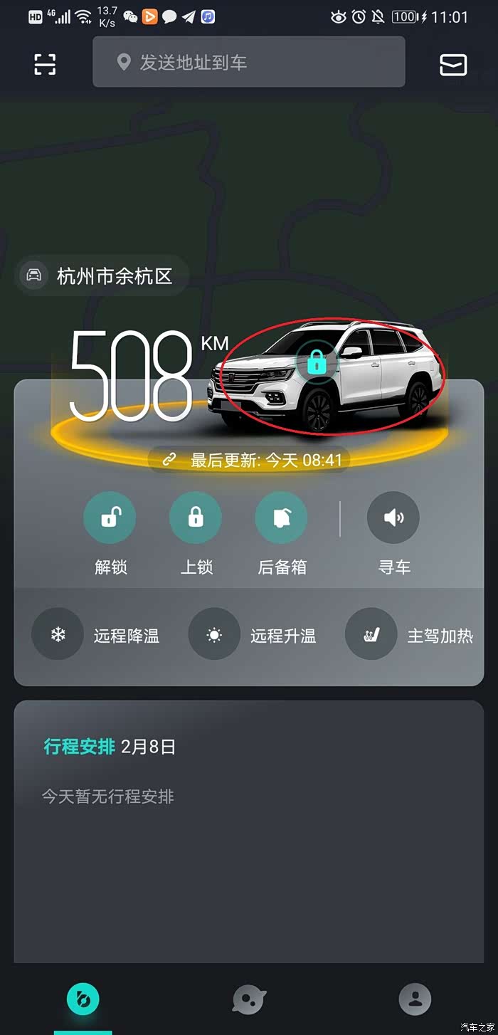 2.看第一页界面,有“解锁、上锁”“升温、降温”“座椅加热”等功能。