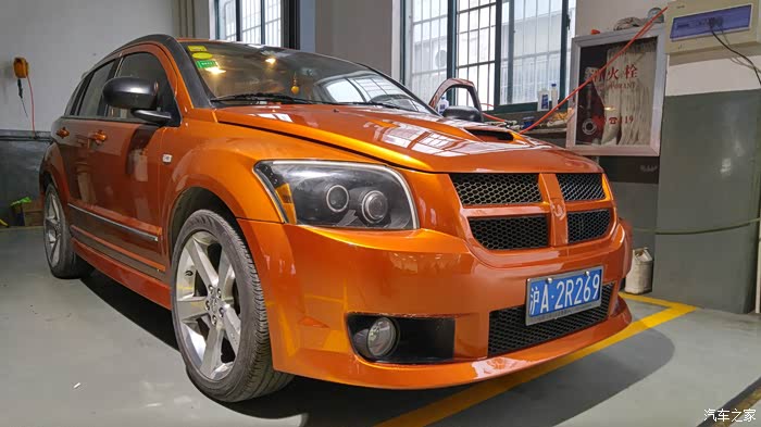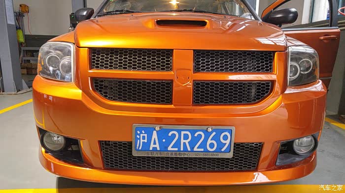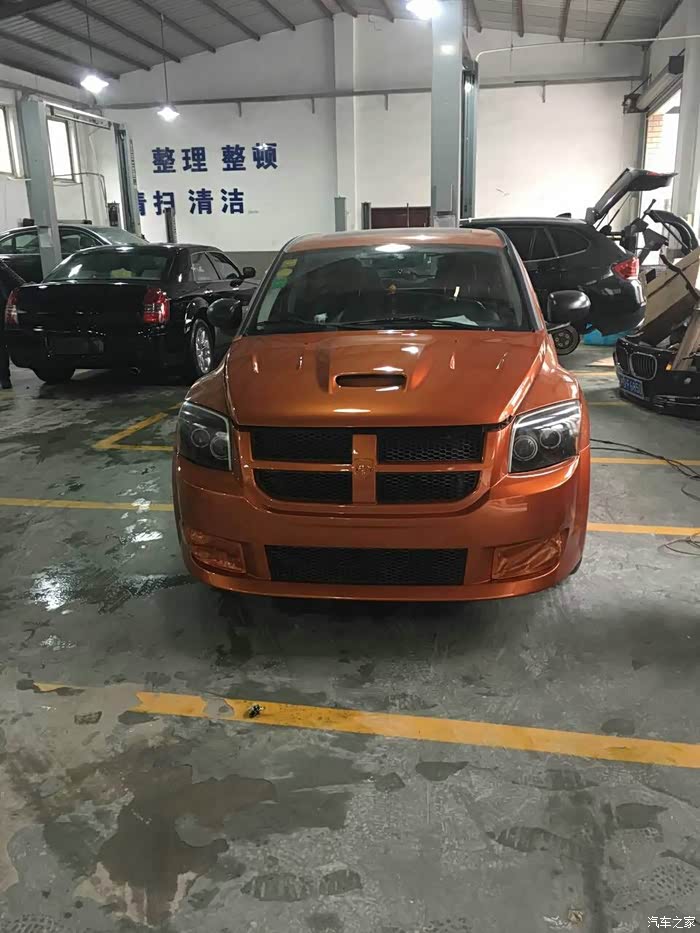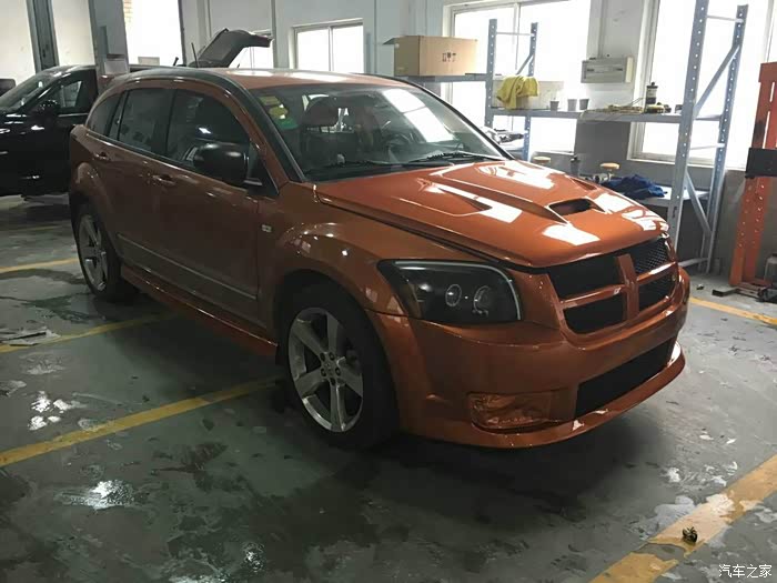 2015年11月12日,改装店发来改装过程照片,装上了SRT4前包围也扣上了SRT4机盖,因为漆面并未干透,就没有把机盖扣上锁,看上去前端有不小的缝隙就不奇怪了。雾灯框和雾灯会在稍后会装上,原本打算等着车友聚首再总装,改装店的老板可不答应再换回我原来的包围了。来上图!