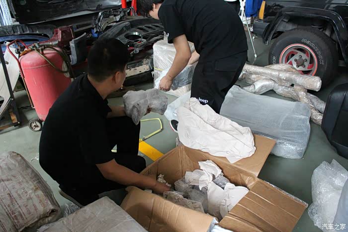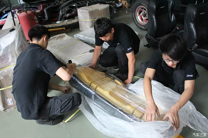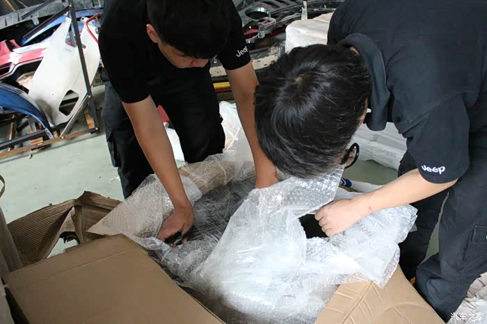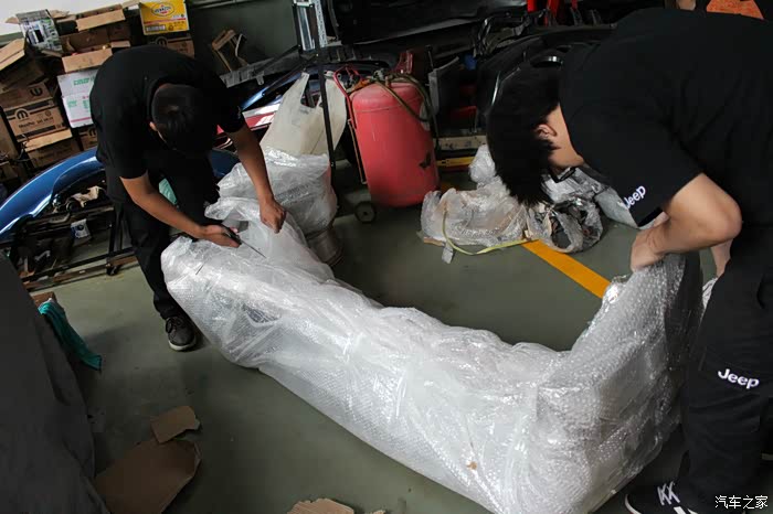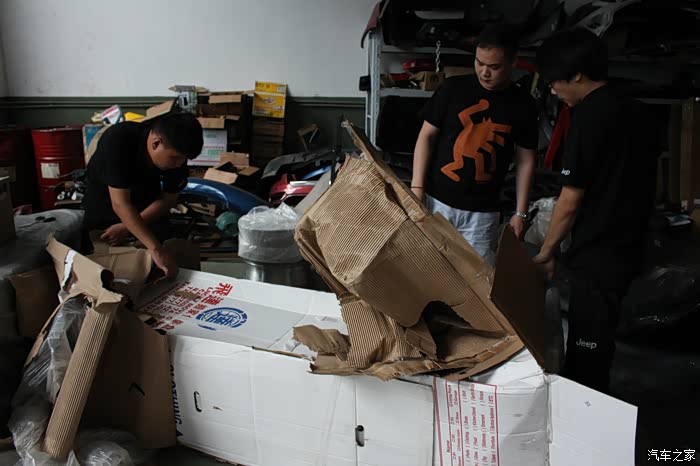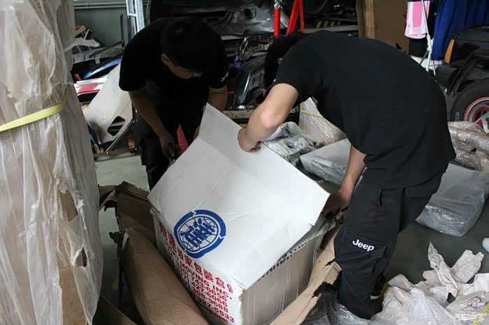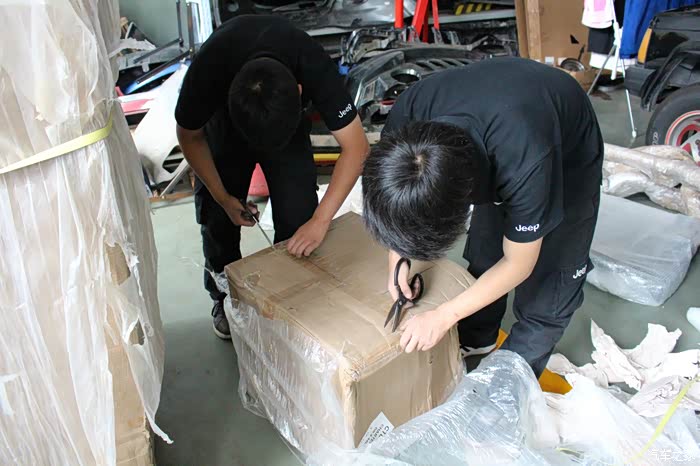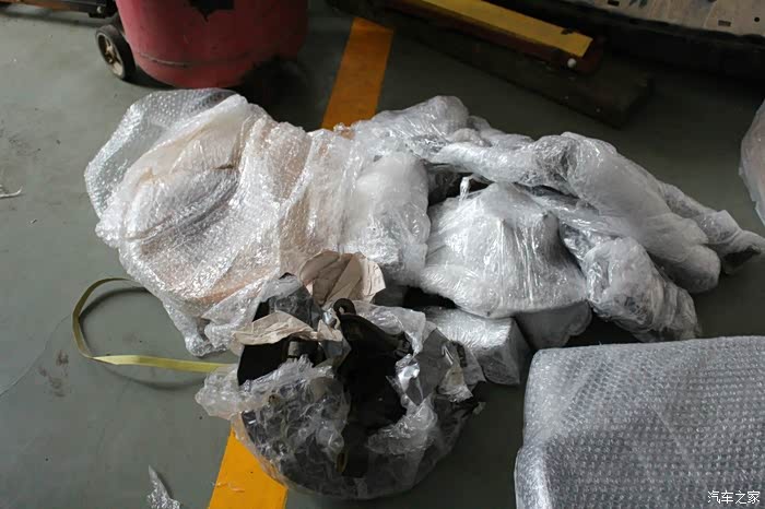 前包围为黑色,是另一台车上拆车件,相比其他全部来自红色SRT4的配件,状态要差不少!什么情况?!差到忘记拍照了,晕!下次补发。粗略看了一下雾灯框貌似只有一个,中网和下部的蜂窝状结构基本完整,位于左边的蜂窝状结构有一块儿破损!而且整体因为捆扎已经变形,需要修复!比预想的状态更为糟糕!!接下来是后包围、侧包围、尾翼等的开封!