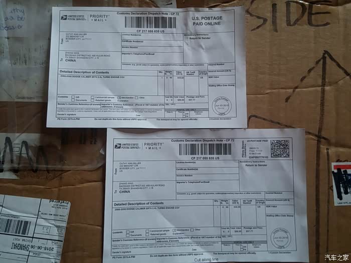 2015年6月2日,从美国始发的Dodge Caliber SRT4发动机盖板(ABS 塑料的那块),在EABUY上找到了这二货(拆车件),竞价最终以50美元成交,并与卖家达成通过USPS(美国邮政)运送到中国上海的方案,运费为57.77美元,NND比货值都贵!不过50美元拿下这块东东绝对值了!SRT4版本的发动机盖板 在EABUY上也确实不多见。