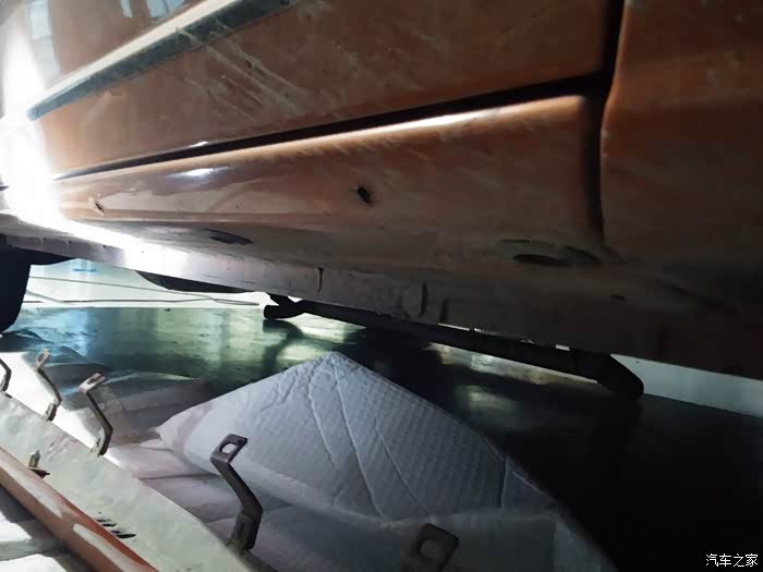 后包围也是没有木箱支撑保护的,在这张图片里,排气管向上,靠近斜面的位置,有一处受到重压造成的压痕,导致后包围右侧向外撇了出去,需要整形,其他状况良好!