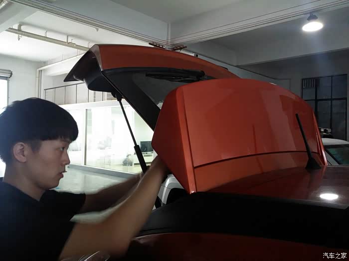 师傅很认真,先进行了高位刹车灯和喷水装置的测试,确定正常运转后在进行的组装(喷漆的时候拆除了刹车灯所在的塑料结构,其中还包括了喷水装置)
