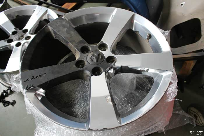 时间仓促,撕膜也是将两只边缘有些许狗啃印子的轮毂撕干净了(可能是前轮因为前部撞击所以可能受损)后轮其中的一只,在这张照片里靠下的这根轮辐上有一处较大的损伤,但不深,找我之前轮毂的修复厂家应该可以搞定!