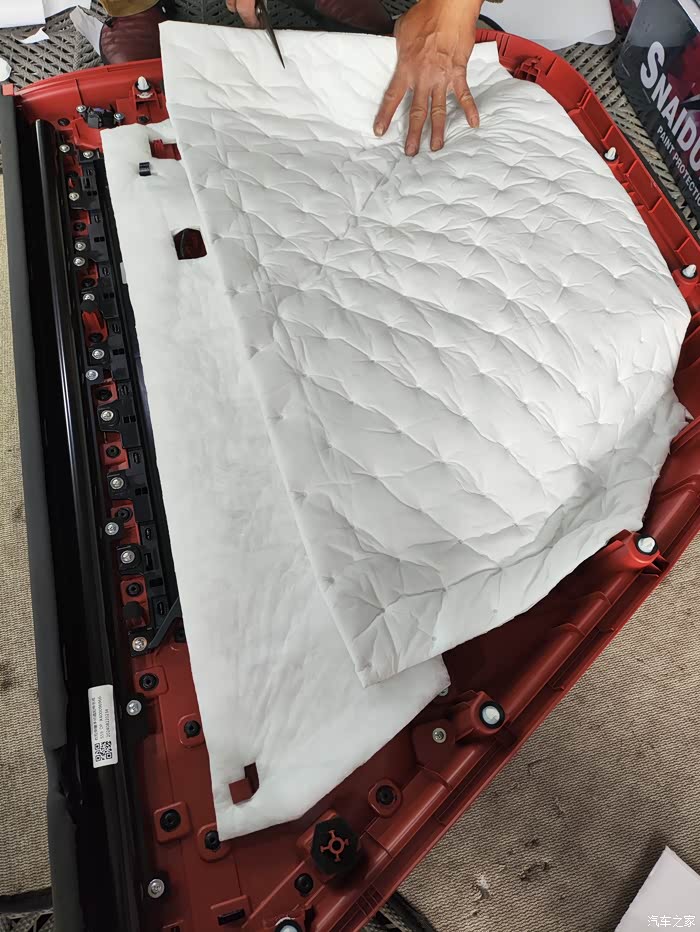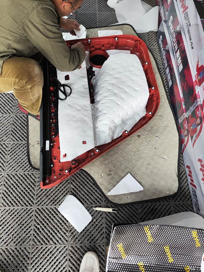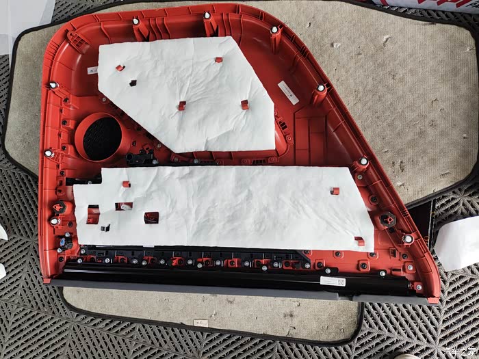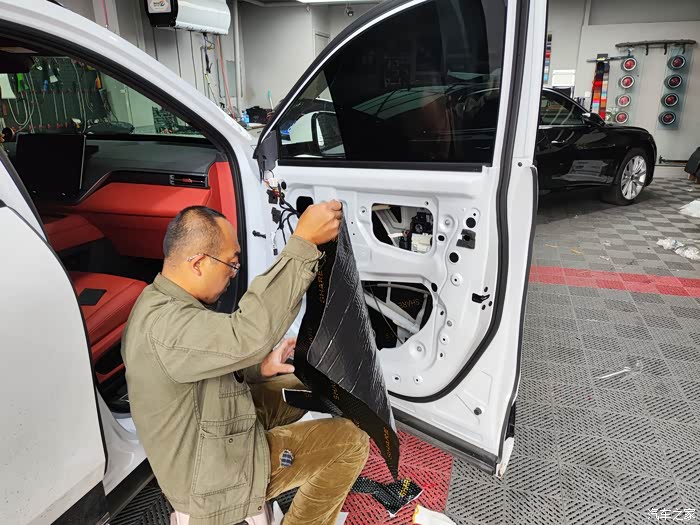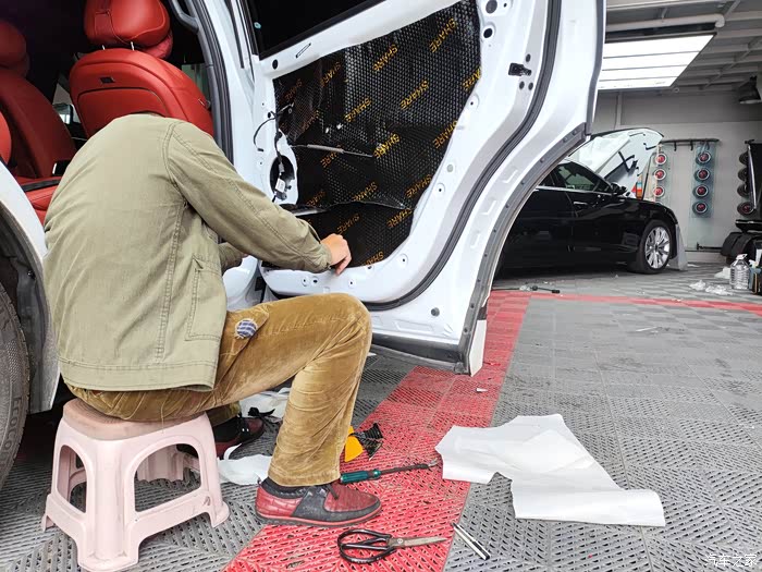 看着师傅麻利地清理车门上的灰尘和杂物,我心里的担忧也少了几分。师傅先在车门内层贴上了一层止震板,他一边贴一边给我解释:“这层止震板能有效抑制车门钢板的振动,减少噪音的产生。”接着,他又在车门外层满满贴了一层止震板,又在车内饰板里贴了一层隔音棉,“这隔音棉就像给车门穿上了一层厚厚的棉衣,既能隔音又能隔热。”师傅的手法十分娴熟,每一块材料都贴得严严实实,边角处理得也很细致。