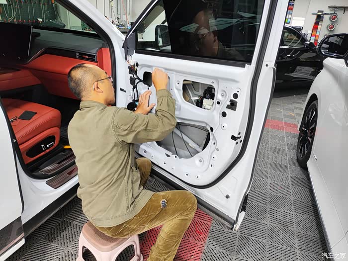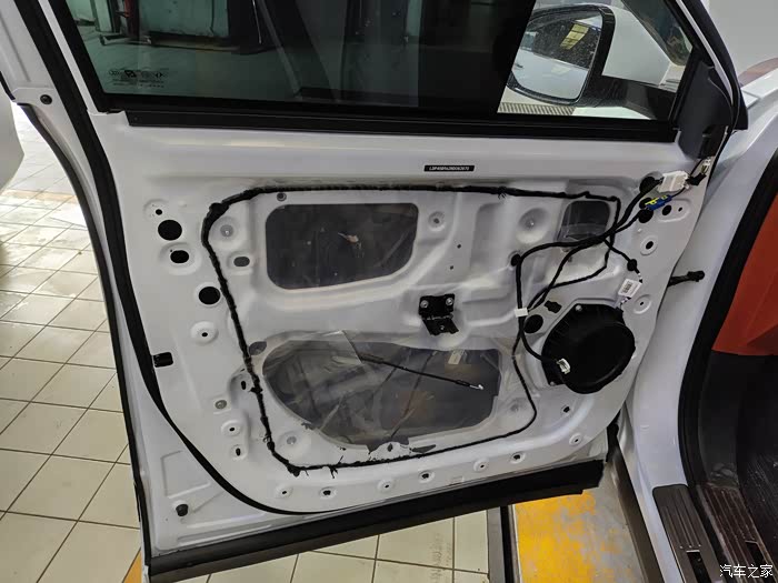 安装师傅开始工作了,他熟练地拆下车门内饰板,露出了车门内部的构造。看到了车门内只有一张塑料薄膜,和那一点点少到可怜的静音棉,师傅都说不冷才怪呢!
