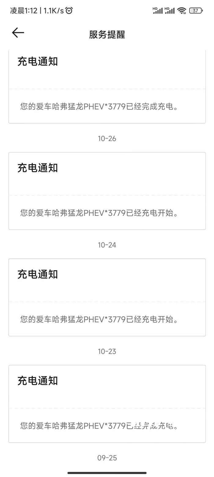 不过把我的车子充满电还是可以的。提车那天我也收到了哈弗智家APP发来的服务提醒消息。