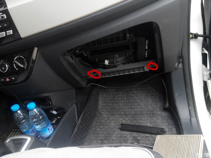 图片中两个红点,是两个螺丝的位置,拆掉螺丝,就可以慢慢拿下手套箱。看图