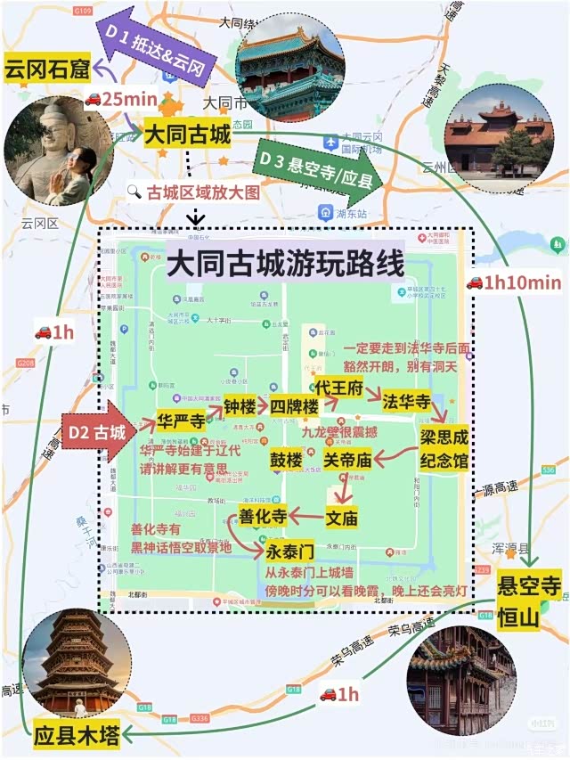 第二天:大同深度游,自然与人文交织 。上午前往云冈石窟,下午古城华严寺、鼓楼、钟楼、法华寺。