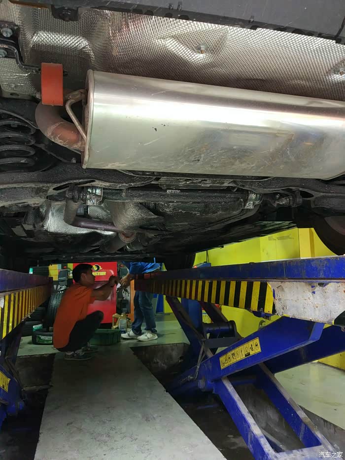 师傅正在给我检查底盘并准备放机油(师傅说首保的机油很差)我想说不用说免费的没好货。。。。