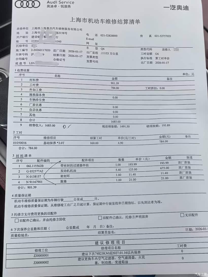 本次保养的总费用为 1685元,包括工时费784元和材料费901元,机油价格占了大头。这个价格是4S店的公开标准报价,没有保养券的话还是有点小贵。但是对于仍在质保期内的车辆,在4S店保养虽然单次成本较高,但能确保使用原厂配件、流程规范,并且保养记录完整,有利于后续的质保服务。