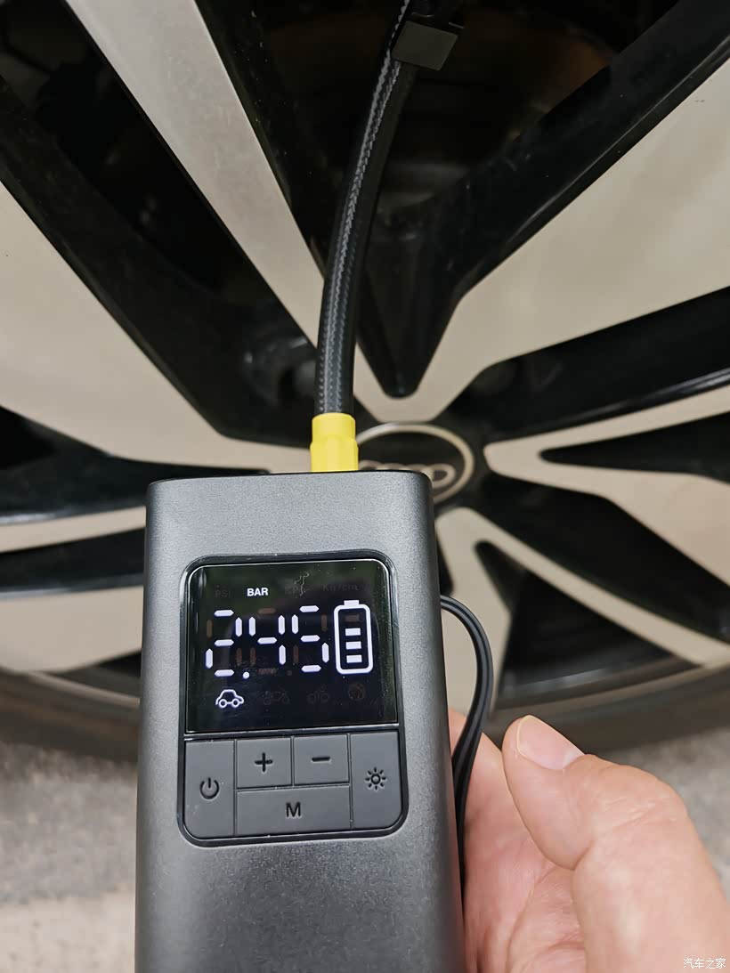 接下来检查四轮轮胎磨损情况(我的车胎况良好,磨损均匀)。随后,使用数字胎压计,严格按照车门标签上的标准值(前2.3,后2.5),为四个轮胎补充了气压,确保压力一致。