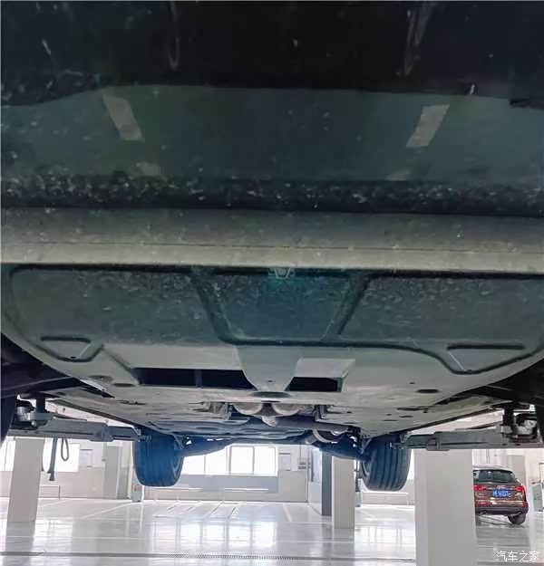 车辆被举升机抬起后,技师手持强光手电,对底盘进行了系统性检查。