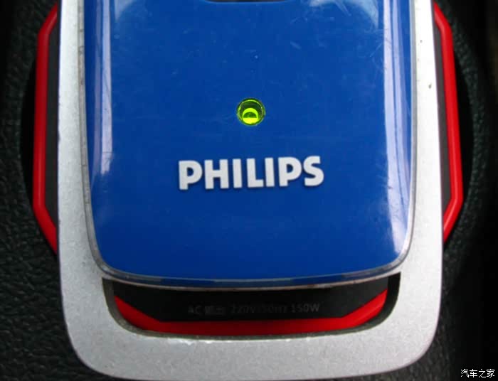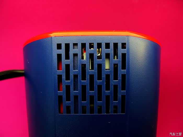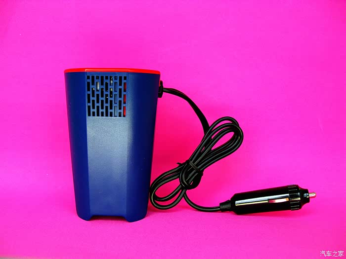 逆变器的体积与我想象的相差很大,原来就是车载烟灰缸大小。好处当然就是语文体积小,方便搁置了,而且几乎和所有车型通用。杯身是蓝色调,顶部边缘及USB充电口边缘采用鲜艳的红色。